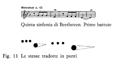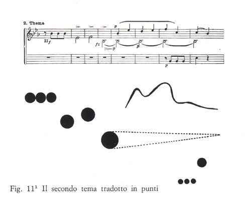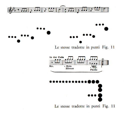 2 - Termini significativi La stretta connessione concettuale tra musica e spazio si manifesta anche a livello linguistico. La descrizione dei fenomeni sonori, sia nel linguaggio comune che in quello specialistico, poggia sullutilizzo di metafore spaziali. In questo caso lo spunto può essere confrontare il senso spaziale dei termini con quella offerta dalla Enciclopedia della Musica, Garzanti, diffuso strumento per lo studio musicale elementare. 2.1 Dallo spazio alla musica I due esempi di uso comune dei termini musicali fanno emergere concretamente come le metafore spaziali siano ormai talmente consolidate da essere utilizzate inintenzionalmente nel linguaggio musicale. Luso irriflessivo tipico del senso comune conferma lestrema efficacia di queste metafore. Altezza La relazione tra spazio e fenomeno musicale si esplicita anche nella notazione musicale occidentale. Infatti, dato un sistema di riferimento notazionale (ad esempio il pentagramma), un suono grave sarà collocato nello spazio grafico più in basso rispetto ad uno acuto. Questo procedimento di notazione rappresenta graficamente, perciò anche spazialmente, le frequenze minori o maggiori che connotano un suono. La collocazione nello spazio grafico è quindi una metafora utile a descrivere un fenomeno musicale, metafora che è consolidata nelluso comune tanto da sostituire quasi completamente i termini grave ed acuto. Verticale/orizzontale Nel linguaggio comune verticale e orizzontale significano rispettivamente ortogonale o parallelo al piano orizzontale o al terreno, mentre nel linguaggio musicale sono collegati rispettivamente ai due aspetti armonici e melodici del fenomeno sonoro. Quindi i due termini verticale ed orizzontale si riferiscono a strutture di pensiero, melodia e armonia, che non sono necessariamente connotate nello spazio, ma che lo sono diventate con lassimilazione di questa metafora nel senso comune. 2.2 Dalla musica allo spazio Allo stesso modo due esempi di trasferimento di concetti musicali in termini spaziali e di uso comune mostra che leffettiva interattività tra i campi conoscitivi e pratici può avvenire grazie alluso di metafore. Ritmo Armonia (Kandinsky - da Punto, linea, superficie) |