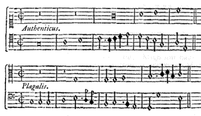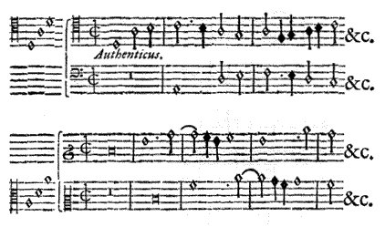 Dai quali esempj si vede chiaramente, che tra questi due Modi non avvi altro divario, se non che la modulazione del Plagale sia più grave, e il soggetto di lui finisca nellintervallo collaterale, vale a dire E, & B. Gian Maria Bononcini oltre la modulazione grave, e per questa cagione oltre la mutazione delle Chiavi, vuole che secondo la natura del Modo Plagale, i soggetti discendano in Quarta. Angelo Berardo, Autore per altro da non isprezzarsi, sembra che distingua soltanto di nome il Modo Autentico dal Plagale: senza avere riguardo ai soggetti ascendenti, ed alla modulazione acuta, o grave: anzi intuisce una modulazione più grave nel Modo Autentico, che nel Plagale, come dimostrano i di lui esempj.