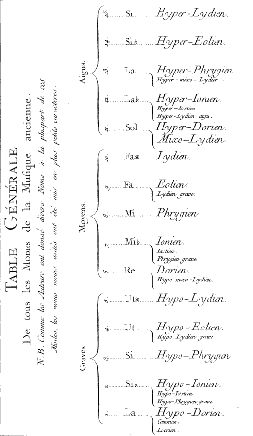 * * * Molto spesso il passaggio tra modalità e tonalità viene trascurato nei trattati di armonia. Sebbene sia argomento del programma del corso di armonia complementare, lo troviamo trattato o in modo superficiale o in modo molto approfondito. Spesso il concetto di modalità crea confusione ed è difficile trovare materiale chiaro ed esaustivo senza addentrarsi in ambiti superspecialistici quali quelli della musica greca o della musica medievale. Proprio per questo abbiamo deciso di cercare di fare una ricapitolazione di alcuni materiali a nostro avviso molto validi che trattavano questo problema. Abbiamo utilizzato essenzialmente un libro di Loris Azzaroni e il manuale di armonia di Vittorio Vinay: il primo tratta il problema in modo molto approfondito, mettendo a fuoco il passaggio tra modalità e tonalità nellanalisi di alcune toccate frescobaldiane. Il secondo dà un quadro complessivo e una panoramica generale della questione. Per rendere comprensibile a tutti il problema del passaggio tra modalità e tonalità, abbiamo ritenuto opportuno aggiungere una premessa che spiegasse in modo conciso ma per i nostri scopi conciso il concetto di modalità. Spinti dalla curiosità abbiamo poi guardato come questo problema veniva trattato da due grandi pensatori musicali: Ernest Ansermet e Jacques Chailley. I testi analizzati di questi due autori non sono trattati di armonia, quindi affrontano la questione secondo ottiche diverse da quelle solite. Per concludere la ricerca abbiamo inserito un capitolo dedicata al rinascere dei sistemi modali tra Ottocento e Novecento, dove abbiamo analizzato brevemente come questo linguaggio sia stato utilizzato da alcuni compositori-tipo per far fronte alla crisi del sistema tonale. Ci scusiamo se qualche pagina risulterà un poco pesantuccia per i modem 56k: d'altronde la grafica era necessaria e l'adsl si sta diffondendo... Lo schema delle modalità nell'Enciclopedia di Diderot e D'Alambert |